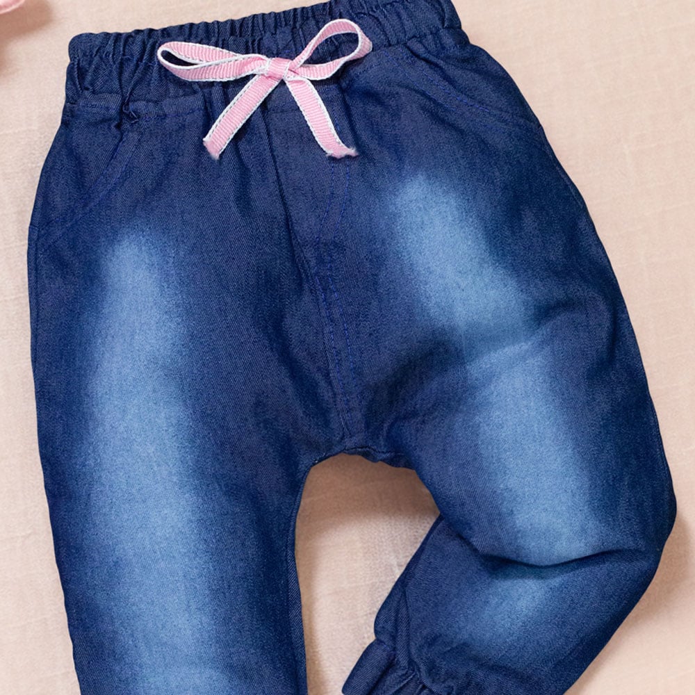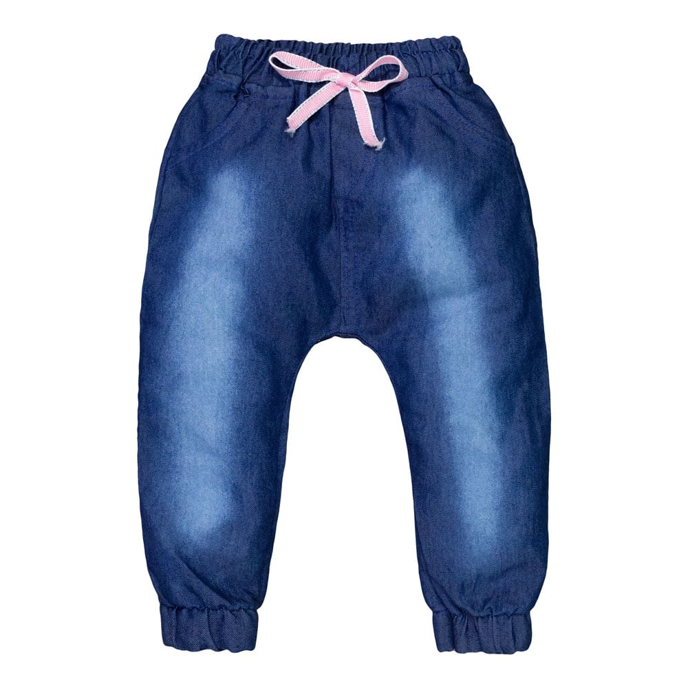 Calça Jeans Jogger Bebê Lavagem Escura E Cordão Rosa