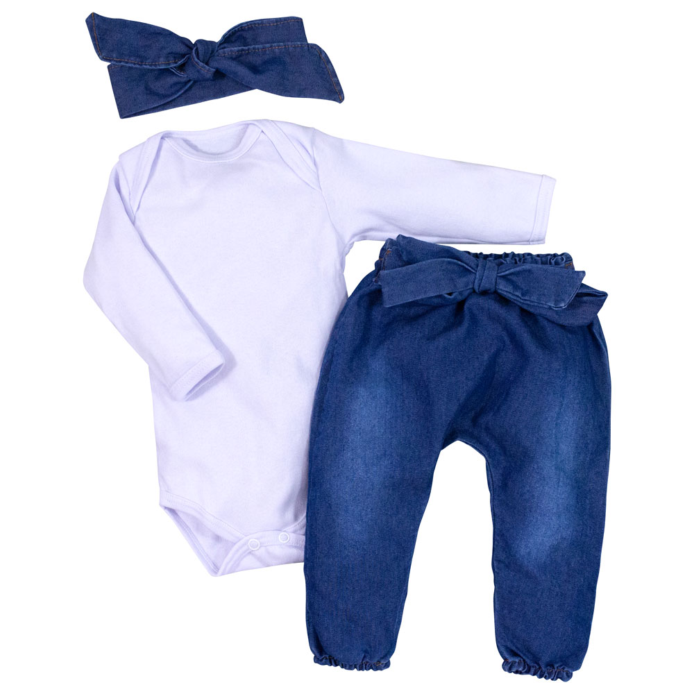Conjunto composto por: Body manga longa, calça jeans e faixinha para cabelo. Body manga longa com gola americana, facilitando na hora da troca pois possui abertura nos ombros. Calça jeans confortável, macio e leve com elástico na cintura e no punho, dando um estilo próprio. Possui tira na cintura para dar um laço e combinar com a faixinha jeans que vem junto para formar o look blogueirinha perfeito para sua bebê.
